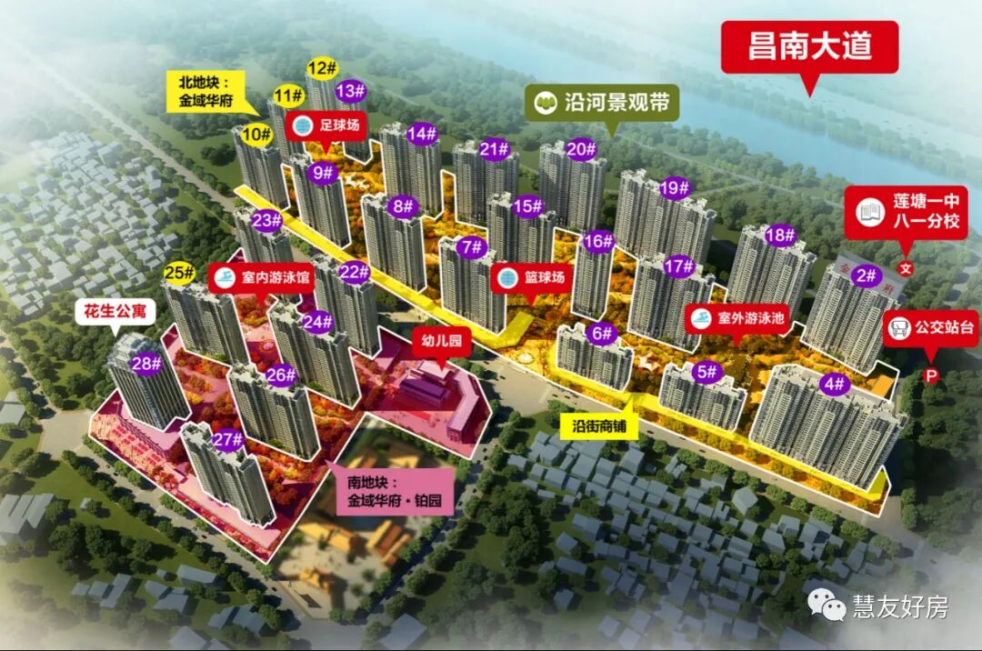 01 雄踞南昌城市二环旁 抢占南昌东站价值高地 二环线作为南昌主要城区的黄金交通动脉,串联了新建区、九龙湖新城、朝阳新城、青云谱、青山湖、象湖新城及高新区等重要城市主功能区,未来也将是南昌西站与南昌东站的主要交通路网,项目坐落南昌城市南二环线上,坐享青云谱、青山湖、高新区及南昌县四区城区商圈,位于南昌东站核心辐射圈,未来城市地位潜力巨大。 02 出门即二环快速路 畅享半小时主城繁华圈 项目位于高新大道与昌南大道交汇处,坐享多维立体交通畅达全城;出门上昌南快速路,可快速直达朝阳新城、新洪城大市场,一路无红绿灯直达九龙湖新城(西客站、省政府),预计2024年东二环(高新大道快速路)正式通车(已规划2022年正式开工),从项目出发上东二环可快速畅达解放东路万达、龙湖商圈,再往北可无缝对接北京东路市中心区域及高新区,真正做到半小时都市繁华交通圈。 一城繁华精粹 轻松拥享 项目内享2.6万方商业街,外揽青山湖万达广场、绿滋肴庙街(在建中)、龙湖天街(在建中)、广州路等四大商圈,预计未来2024年随着城市东二环高新大道快速路的通车,可直接下北京东路享受华润万象汇、恒茂梦时代等商圈;一城商业繁荣精粹,城市缤纷多彩生活,随心所欲。 0 住莲一中八一分校旁 小孩教育快人一步 莲塘一中是江西省的优质中学,曾被评为“南昌市十大名校”、“百强高中”,相信莲塘一中八一分校也将继承总校的师资力量,为孩子提供优质的教育资源。而且莲塘一中八一分校就在小区旁,家长无需早起贪黑接送,只需在阳台目送,生活自然更美好。 十年精筑一城,铸就60万方人居标杆 百城发展专业团队倾心投入,因为专注所以更懂南昌人,金域华府项目是集团花费巨资近十年精力倾心全力打造的一座60万方宜居大城,大到建筑,小到园林绿植每一处细节反复铺排设计,只为了精心服务好每一位业主,全力做好每一处品质细节。 全城罕见高拓产品 小面积享受大空间 项目85-130㎡全系产品户型端正实用,适用各阶段家庭住房需求,100㎡A户型更是具备豪宅标志的大横厅设计,做到南北通透,双卧朝南;全系户型均配只有大平层才有的豪宅大面宽落地窗,采光通风良好。全通透客餐厅设计,超长跨度,彰显高端大气;买2房得“4”房用到的比买到的多,乐享三代同堂上老下小。 尊享皇家园林配套 生机勃勃的天然氧吧 金域华府项目小区内享35%绿化率,精筑美好生活,移步异景,推窗既见密植立体景观。小区内运动设施齐全,2大游泳池、篮球场、足球场、羽毛球场、跑道,打造全龄化运动社区。外揽八大山人梅湖景区,以及景区内部投入6亿元,占地864亩的南昌市花博园,闲暇之际,可就近欣赏山光水色,粉墙黛瓦。 百强恒兴物业 以极致服务呵护每个家庭 项目引进恒兴金牌物业服务,守护365天幸福生活拥有一级物业管理资质、荣膺“物业服务百强企业”的恒兴物业,为社区业主提供管家式尊崇服务。安全巡逻、门卫站岗、社区保洁……别人眼中的优质,只是这里的标准。24小时真诚服务,形成一个生活与尊崇同在、生活与邻里同在的高尚圈层社区。 项目基本信息 开发商:南昌百城发展有限公司 计容建筑面积:569480㎡ 容积率:2.30 总户数:5400户 物业公司:恒兴物业 物业管理费:2.8元/㎡/月 在售热销户型 项目样板房图鉴